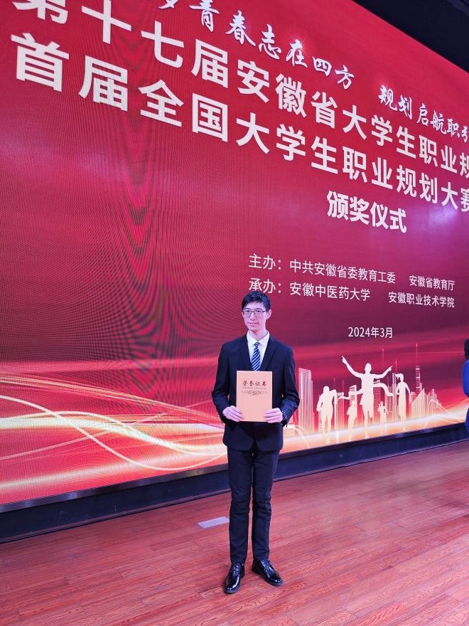 3月13日至14日,由安徽省委教育工委、省教育厅主办的第十七届安徽省大学生职业规划大赛暨首届全国大学生职业规划大赛安徽赛区决赛圆满落幕。经过激烈角逐,太阳新城官网2021级智能建造专业本科生许晋嘉最终荣获一等奖,总成绩排名第一!