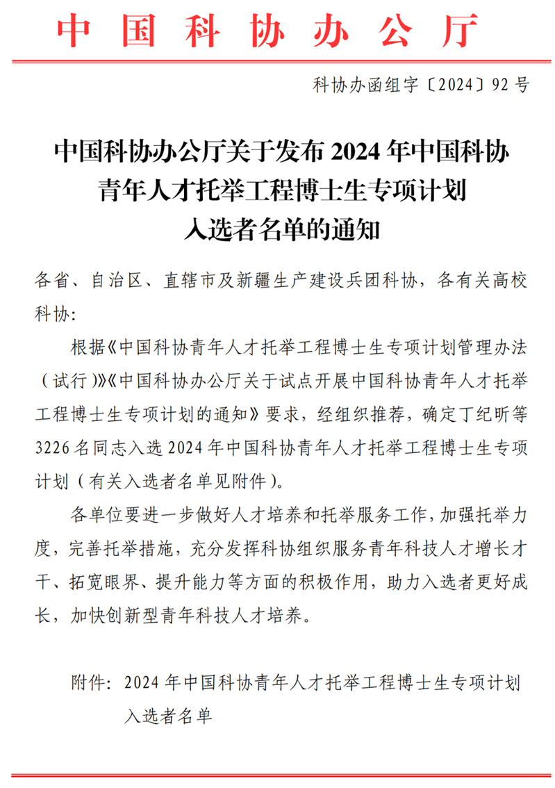 近日,中国科协办公厅发布了2024年中国科协青年人才托举工程博士生专项计划入选名单,太阳新城官网仇文凯等4名博士研究生成功入选。